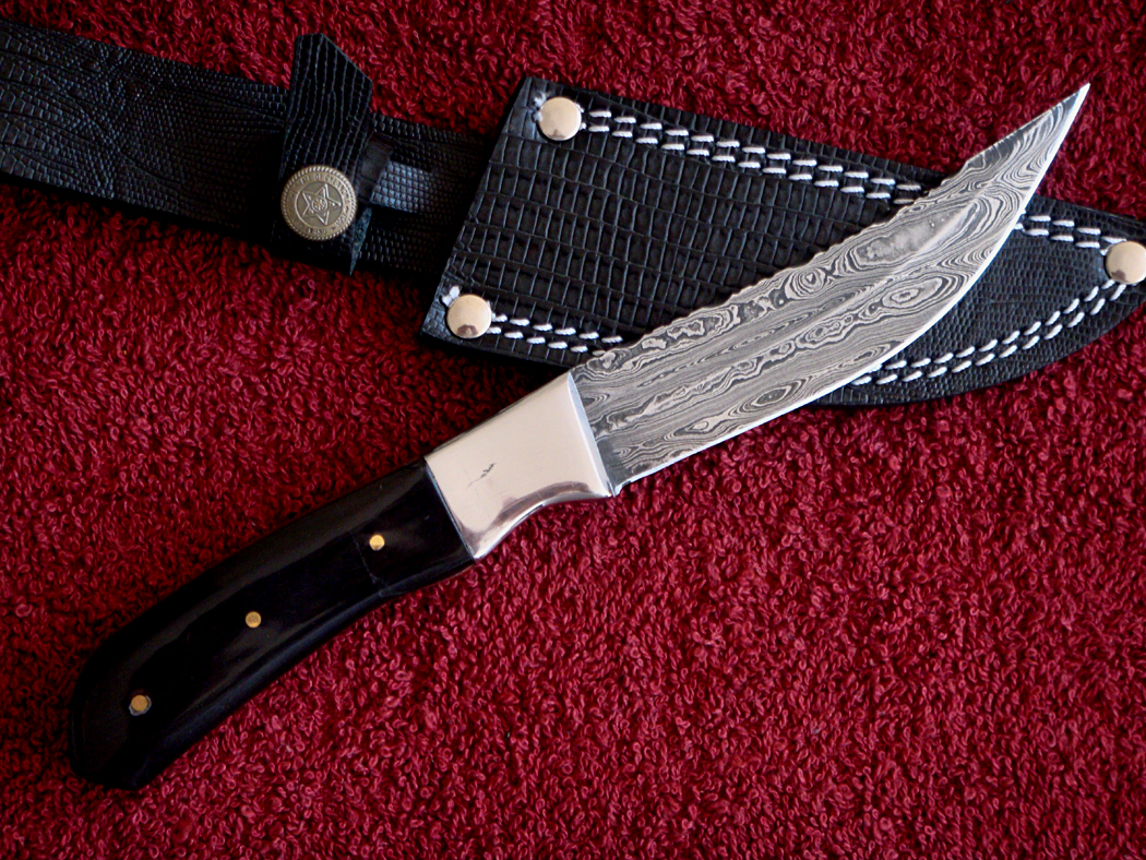 Special featured hunting knives, specially designed in wood handle for cold season, with antistatic hand work on brass available in any pattern i.e. rain-drop, twist, ladder or random. Our formation of Damascus Steel is consistent in quality ( 15N20 1095 ) simply “ Double High Carbon Nickel Steel” with 58+HRC Temper  |